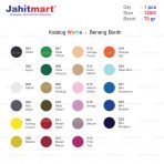 001 Hitam, 002 Putih, 003 Kabut, 004 Abu Sejuk, 005 Kuning Lemon, 006 Moster, 007 Hijau Pohon, 008 Hijau Amazon, 009 Kulit Kacang, 010 Hijau Zaitun, 011 Merah Cabe, 012 Merah Marun, 013 Orange Pucat, 014 Kayu Manis, 015 Merah Muda, 016 Bunga, 017 Mauve, 018 Pink Tua, 019 Orange Api, 020 Hijau-Biru, 021 Biru Doraemon, 022 Biru Elektrik, 023 Biru Dongker