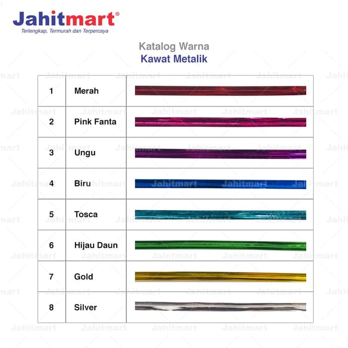 01 Merah, 02 Pink Fanta, 03 Ungu, 04 Biru, 05 Hijau Tosca, 06 Hijau Daun, 07 Emas, 08 Perak