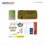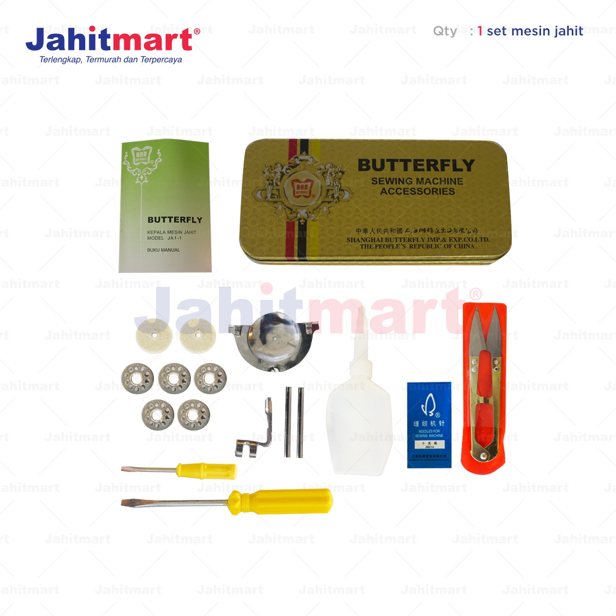 – 1 Tool Kit Standard BUTTERFLY JA-1 (5 bobbins, 1 Jarum Singer, 1 Sepatu Kelim, 1 Tube Oil, Kartu Garanasi, dll.)