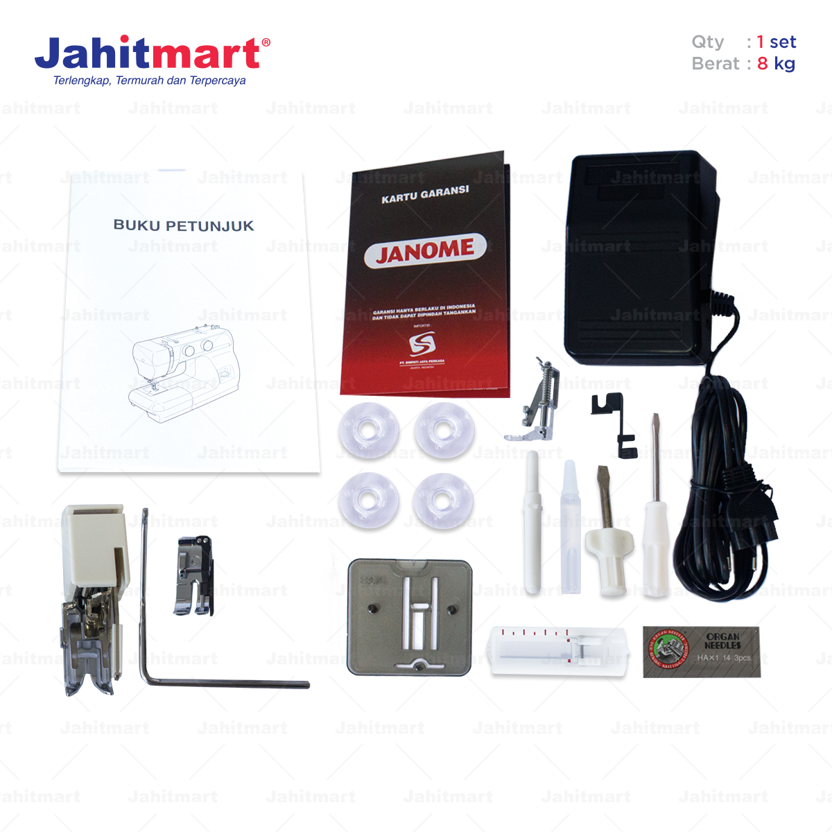 – 1 Tool kit set (sepatu lobang kancing, sepatu overcasting, sepatu kelim, sepatu satin stitch, sepatu bodir, sepatu even feed walking foot, sepatu semi obras, sepatu zipper, oil, obeng, jarum, spool, dll).