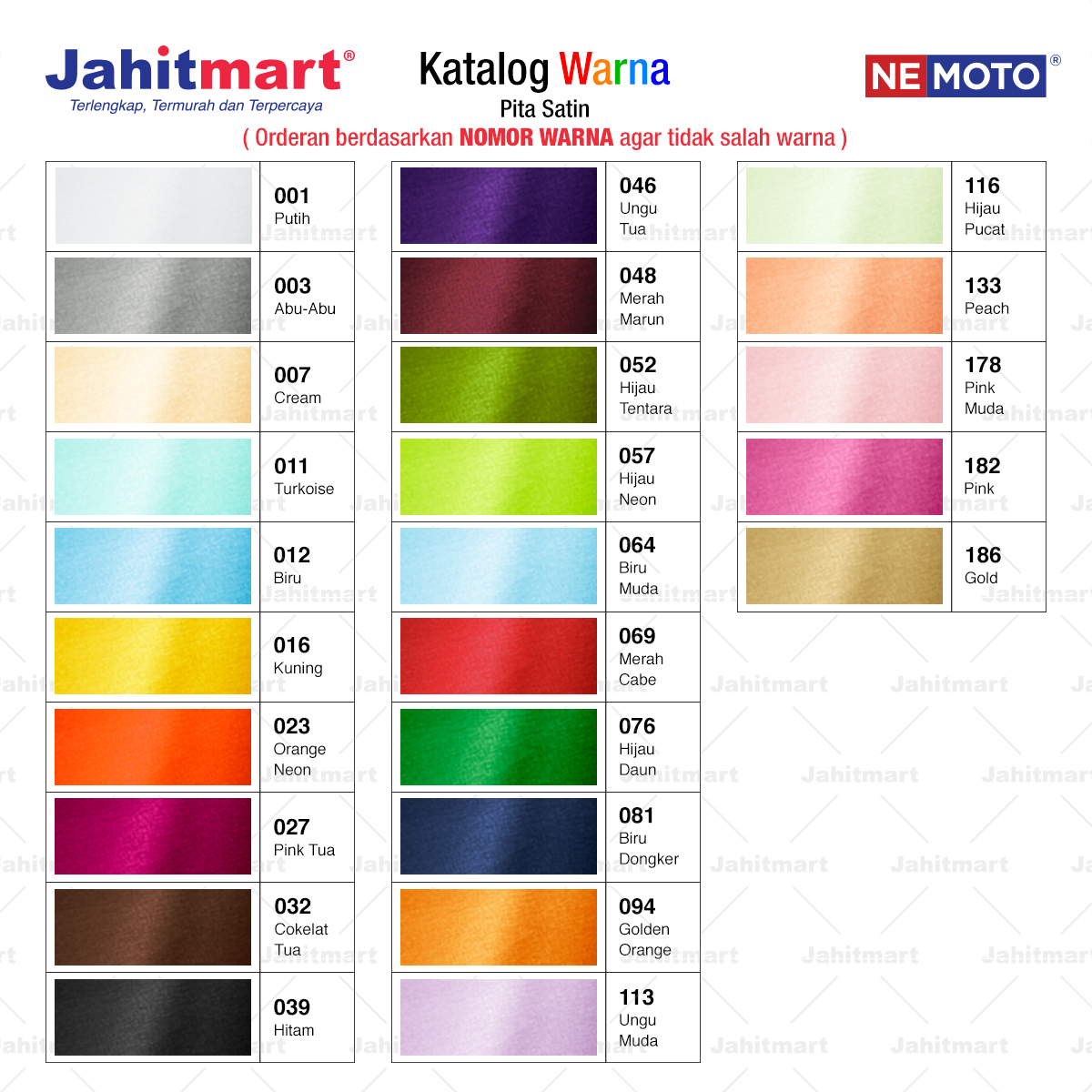 Pemesanan berdasarkan NOMOR WARNA agar tidak salah warna.
