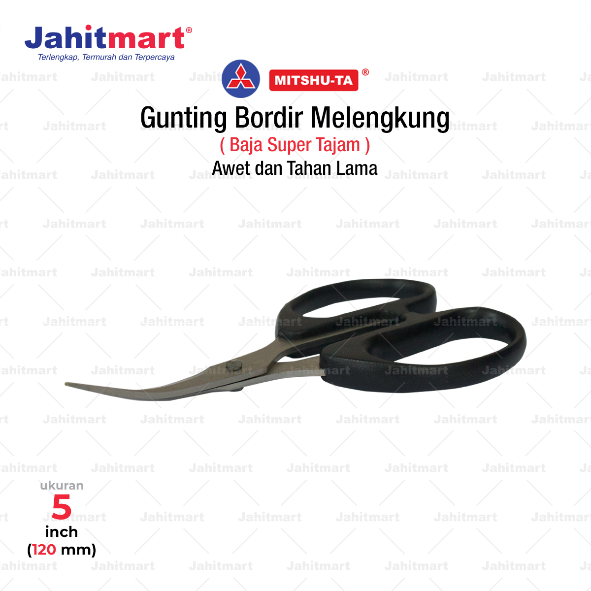 Gunting Kain Bordir / Aplikasi Lengkung “MITSHU-TA” memiliki ujung gunting yang melengkung sehingga mempermudah proses menggunting sisa benang pada hasil bordiran sehingga benang dapat terpotong tepat pada pangkal benang.