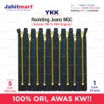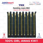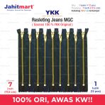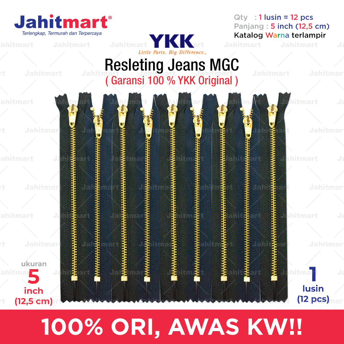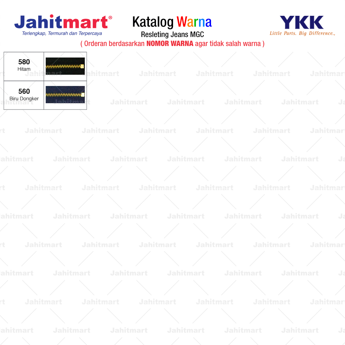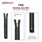 Ritsleting Jeans MGC merk YKK memiliki gerigi besi berwarna keemasan yang umumnya diaplikasikan pada celana/jaket berbahan jeans.
