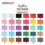01. Putih, 02. Putih Gading, 03. Hitam, 04. Merah, 05. Merah Bata, 06. Marun, 07. Salem, 08. Pink, 09. Dusty Pink, 10. Fuchsia, 11. Kuning, 12. Orange, 13. Lilac, 14. Ungu, 15. Unggu Anggrek, 16. Ungu Tua, 17. Mint, 18. Toska, 19. Biru Muda, 20. Biru, 21. Navy, 22. Hijau Daun, 23. Hijau Botol, 24. Rose Gold, 25. Krem, 26. Gold, 27. Cokelat Muda, 28. Cokelat Tua, 29. Abu Muda, 30. Abu
